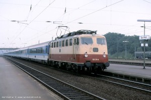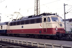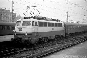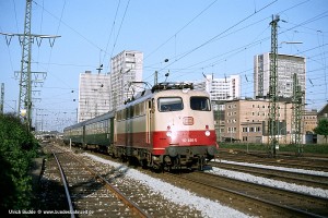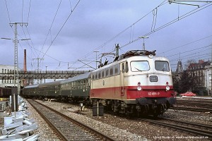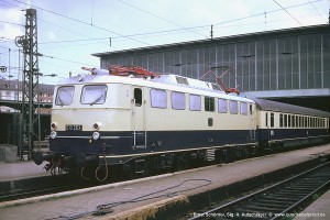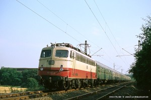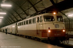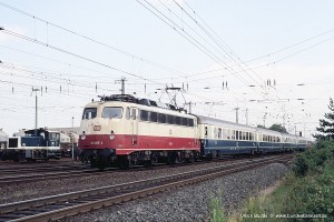 Wie bei den 110.1 Serienloks gab es auch bei der BR 112 die Variante mit Griffstange und UIC-Steckdose/Aufstieg. Diese Variante hatten (wieder einmal) die "Mehrfach-Exoten" 112 308 und 311 zu bieten (s.a. Bild 28). Aufnahme: 112 311-6 (HEid) vor D956, Nürnberg Hbf, 05.06.85. |