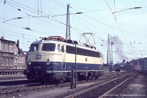 Wie bei den normalen Bügelfalten-E10 ging die DB Anfang der 70er Jahre daran, auch bei den 112 die Pufferverkleidungen und Schürzen abzubauen; nicht immer alles auf einmal, manchmal auch zunächst nur die Pufferverkleidungen und/oder nur Teile der Schürze. Aufnahme: 112 312-4 (DoB) vor D347 in Hamm(Westf.), 24.05.74. |