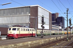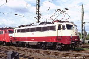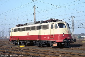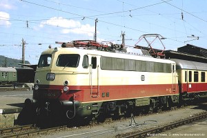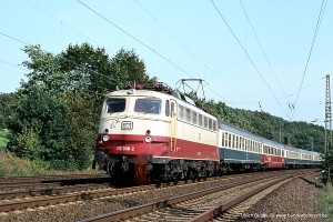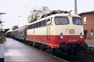 Bestandteil des ab 1976 eingeführten ozeanblau/beigen Farbschemas war die Festlegung, dass die Baureihen 103 und 112 ihren rot/beigen Anstrich behalten sollten. Farbaufteilung allerdings wie bei o/b, also ohne farblich abgesetztes Dach und der gesamte Rahmen rot. Unklar ist, ob der "beige" genannte Farbton wirklich beige (RAL1001) oder elfenbein (1014) war. Aufnahme: 112 502-0 (HEid) vor D372, Uelzen, 28.10.80. |