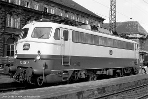 Nachdem das Reinigen der Frontscheiben grundsätzlich auf eine Arbeitsweise vom Boden aus umgestellt war, konnten die umlaufende Griffstange und der zugehörige Trittrost ersatzlos entfallen. Meist geschah der Abbau zusammen mit der Entfernung der Blechregenrinnen und dem Anbau der UIC-Steckdose und des UIC-Auftritts. Aufn. Martin Welzel: 112 489-0 (DoB) mit N5514, Mönchengladbach, 05.09.77. |