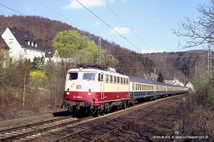 Zunehmende Verschleißerscheinungen an den Drehgestellen der 112 485 - 504 machten in 10/85 eine Herabsetzung der Höchstgeschwindigkeit auf 140 km/h erforderlich. Um eine bessere betriebliche Unterscheidung zu den anderen, nach wie vor für vmax=160 km/h zugelassenen Loks der BR 112 zu ermöglichen, erfolgte zum 01.01.88 die Umzeichnung in die neue Baureihe 114 unter Beibehaltung der Betriebsnummern. Aufnahme: 114 491-4 (HEid) mit D2725 bei Einsal, 04.04.91. |