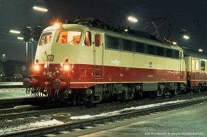Ab Mitte der 70er Jahre wurden die Kabel für die Zugenergieversorgung (ZEV) auf der linken Seite der Front durch eine 2. Steckdose unterhalb des linken Puffers ersetzt. Davon waren alle 112.2/3, aber nur wenige 112.4 betroffen (z.B. 112 494, nächstes Bild). Aufnahme: 112 266-2 (HEid) mit IC558 "Weser-City" in Wunstorf, 05.08.86. |