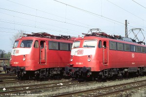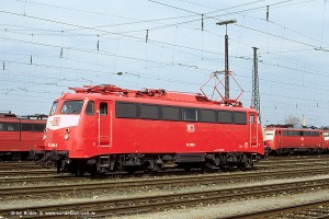 Nur 11 Jahre nach ozeanblau/beige war mit einem neuen Vorstandsvorsitzenden auch das nächste Farbschema fällig: Ab Mitte 1987 galt für alle Neulackierungen: orientroter Lokkasten mit weißem (lichtgrauen) Lätzchen. Alle rot/weißen Loks besaßen kurze Lüftungsgitter der Bauart Klatte und Klatte-Festfenster. Aufnahme: 113 269-5 (MüH), Rbf München-Laim, 22.04.96. |