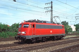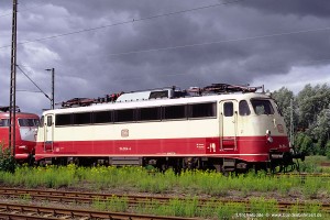 Das reguläre Farbschema "orientrot" sah eine komplette Lackierung des Dachs in dieser Farbe vor. Abweichend davon erhielten einige Loks jedoch ein graues Dach bzw. Dachaufbauten, womit letztlich der Verschmutzung in diesem Bereich Rechnung getragen wurde. Aufnahme: 113 308-1 (MüH), Rbf München-Laim, 22.04.96. |