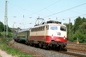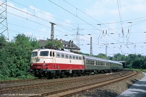 Mit den Jahren zählte jedoch nicht mehr das Erscheinungsbild, sondern nur noch die preisgünstige Beschaffung und Bevorratung von Ersatzteilen. Und so erhielten auch die Loks der BR 112 ab '81 bei fälligen Untersuchungen überwiegend die kurzen Klatte-Gitter mit Klatte Festfenster. Aufnahme: 112 491-6 (HEid) mit N25703 (Sonderzug, DRG-Rheingold, mit 112 498 am Zugschluss), Kalscheuren, 25.08.85. |