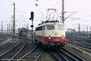 Nach einer größeren Unfall-Ausbesserung im AW Bremen (u.a. mit Komplett- Neuaufbau des hinteren Führerstands) präsentierte sich 114 487 in einem höchst exotischen Zustand mit roten Puffern und roter Pufferbohle. Die übliche Verschmutzung in diesem Bereich führten aber schnell dazu, dass davon nicht lange etwas zu sehen war. Aufnahme Udo Plischewski: 114 487-2 (HEid) vor D2359 in Heilbronn Hbf, 02.03.88. |