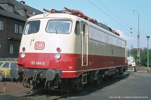 Ab 1972 ging die DB in großem Stil daran, alle ihre Loks für die Aufnahme der automatischen UIC-Mittelpufferkupplung vorzurüsten. Da sich die europaweite Einführung aber leider zerschlug, wurde das Umbau-Programm nach wenigen Jahren wieder eingestellt. Von der BR 112 waren bis dahin nur 2 Loks umgebaut. Aufnahme: 112 494-0 (DoB), frisch aus dem AW nach über einjähriger Unfall- Ausbesserung, Bw Köln Bbf, 16.04.78. |