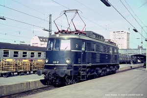 Schon bei meinem ersten Besuch in Nürnberg am 28.08.66 kamen mir innerhalb einer Stunde gleich zwei der begehrten Exoten vor die Linse. Zuerst die damals noch grüne E19 02, die auf einem Stumpfgleis im Westkopf des Hauptbahnhofs auf ihre nächste Leistung wartete. |