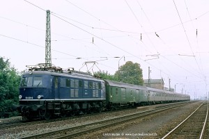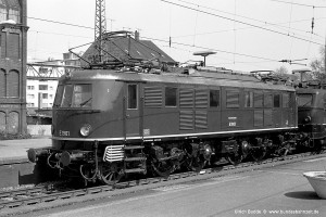 Und noch eine weitere Ansicht schräg von hinten auf 119 012. Im Hintergrund mit 103 120 ein Vertreter der Baureihe, mit der Jahrzehnte später die eigentliche Zielsetzung der E19 umgesetzt wurde: Eine starke Lok für schnelle Züge. |