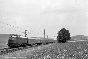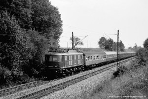 Auf meiner Foto-Tour im Sommer 1972 wurden die 119er dank bekannter Umlaufpläne dann schon gezielt aufs Korn genommen. Damals waren Leistungen in Richtung Westen schon selten, und D586, der zwischen Nürnberg und Würzburg mit 119 gefahren wurde, war deshalb ein Muss - fotografisch umgesetzt am 05.08.72 bei Iphofen mit 119 002 an der Spitze. |