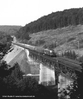Eine Stelle, von der aus man einen Blick von oben auf die Talbrücke bei Möhren hatte, war schon 1972 nur schwer zu finden. Aber für die Rückleistung von 119 001 am 13.08.72 gelang es gerade noch rechtzeitig: Mit dem D587 von Bremerhaven nach München rauscht die AEG-Maschine über das imposante Stahlbauwerk. |