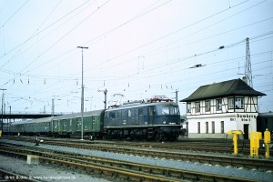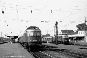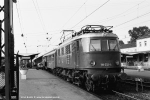 Treuchtlingen war und ist bis heute ein wichtiger Eisenbahn-Knotenpunkt und der Bahnhof Treuchtlingen hatte dem Eisenbahnfreund stets viel zu bieten. E1939 aus Bayreuth zur Weiterfahrt nach München war ab Nürnberg eine 119er-Leistung. Ein 11-minütiger Überholungs-Aufenthalt wurde dazu genutzt, von 119 002 einige Standaufnahmen zu machen. Zunächst spitz von vorn, wegen der ungünstigen Stellung zum großen Fahrleitungsmast auf dem Bahnsteig ... |