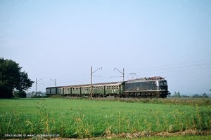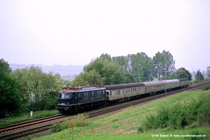 Schon im folgenden Frühjahr kam es überraschend zur nächsten Begegnung mit einer 19er: Auf der großen Festveranstaltung "Tag der DB in Koblenz" wurden neben den üblichen modernen Fahrzeuge auch zahlreiche Altbau-Elloks präsentiert, darunter auch die 119 001. Die Überführung nach Koblenz erfolgte am 22.04.77 in einem Lokzug, der hier auf der linken Rheinstrecke bei Hirzenach zu sehen ist. Hinter der Zuglok 111 058 hingen folgende Altbau-Elloks: 116 006, 144 507, 117 106, 144 183, 194 565 und ganz hinten 119 001. |