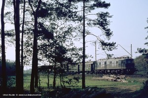 Da ist er wieder, der armselige Personenzug P5728 (vgl. Bild 18), dieses Mal immerhin mit vier Umbauwagen und 119 002 an der Spitze; aufgenommen bei Bubenreuth, nördlich von Erlangen, am 19.09.76. |