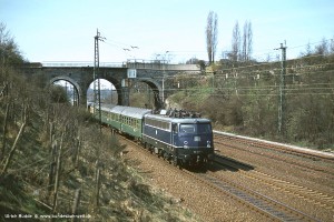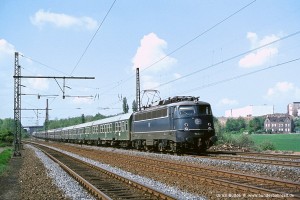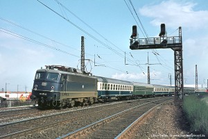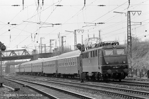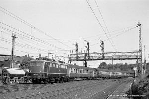 Eine berühmte Fotostelle, die auch schon Altmeister Bellingrodt gerne aufsuchte, ist die östliche Einfahrt nach Wuppertal-Elberfeld. Natürlich wäre mir eine 03.10 seinerzeit lieber gewesen, aber eine Bügelfalten-E10 fast im Lieferzustand ist auch nicht zu verachten. Am 01.10.71 ist es die Deutzerfelder 110 462, die den Pariser Schnellzug D246 bespannt. |