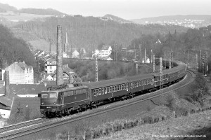 Zur Abkühlung eine Winteraufnahme von der Ruhr-Sieg Strecke. Wir schreiben den 16.02.83 und Bügelfalten-110 mit Pufferverkleidung und Schürze sind generell schon passé; aber auch Loks mit altem Lüfterband sind mittlerweile rar geworden; Eine solche ist 110 459 (KDfd), die mit (E)3165 mühelos und ohne Halt durch den Hp Kirchhundem bergwärts schnurrt. |