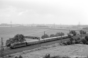 Nachdem die 160 km/h schnellen 112.4 ab 1969 komplett dem Betrieb zur Verfügung standen, wurden Einsätze der 110.1 in F-Zug Diensten selten. Am "Tag der deutschen Einheit" 1971 (für JuFus: 17.06.71) ist 110 462 (KDfd) mit F148 "Porta Westfalica" unterwegs, abgelichtet von der damals gerade erst wachsenden und deshalb noch weitgehend bewuchsfreien Bauschutthalde bei Bochum-Kornharpen. Vermutlich handelte es sich um eine Ersatzleistung für eine 112. |