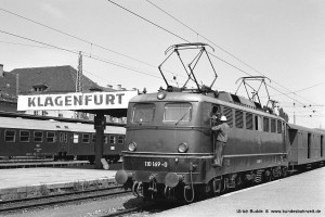Mit einem Reisebüro-Sonderzug ist die Dortmunder 110 169 am 26.07.71 über die Tauern bis nach Klagenfurt gekommen. Solche Langläufe vor schweren Zügen waren damals keine Seltenheit. Bemerkenswert sind nicht nur die beiden Stromabnehmer am Fahrdraht, sondern auch die ungewöhnliche Schrifttype für die neue Nummer, die bei einigen Dortmunder Loks zu finden war. |