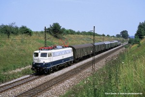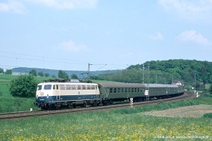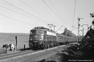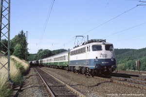 Als ich am 10.07.88 die Kölner 110 304 mit ihrem E3075 in Hermannspiegel aufnahm, hätte ich nicht gedacht, dass dieser Ort später einmal zu einer der bekanntesten Fotopunkte der Nord-Süd Strecke werden würde. Damals gab es allerdings auch noch nicht die heutige Straßenbrücke. Interessanter war da schon, dass 110 304 eine der vier blauen 110.3 mit kurzen Klattegittern ohne Mittelfenster war! |