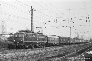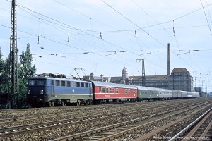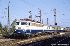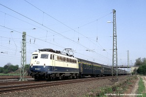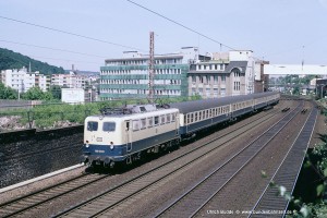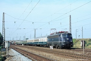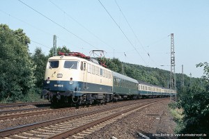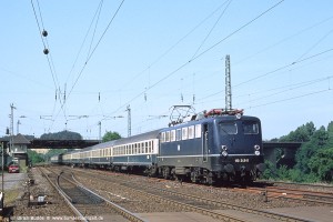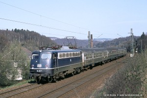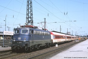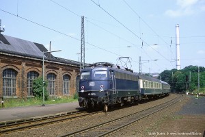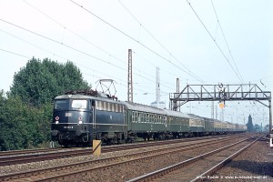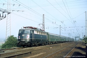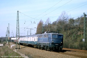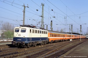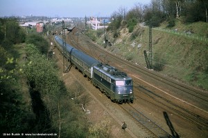 Zwei 110er vorm Zug, d.h. Nutzvorspann, kam im Regelbetrieb so gut wie überhaupt nicht vor; man konnte schon froh sein, wenn eine zweite Lok als "Wagen" mitgeführt wurde. Umso besser, wenn es zwei blaue waren. So wie hier am 08.05.85, als 110 448 und 110 470 (beide DoB) vor FD722 "Berchtesgadener Land" in Düsseldorf Unterrath abgelichtet werden konnten. |