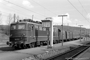 Die Fotokurve bei Tamm war nicht nur gut für Altbau-Elloks und Altbau-ETs (z.B. Galerien "schwäbische Krokodile", "ET-Direktion Stuttgart"), sondern auch für Einheits-Elloks aller Art. Die Kölner 110 471 hat in Stuttgart den D214 "Rhein-Express" nach Hoek van Holland übernommen und macht sich jetzt auf den langen Weg nach Emmerich. Tamm, 08.04.76. |