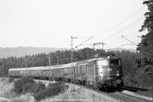Von noch größerem Kaliber als D1285 auf dem vorangegangenen Bild ist der D299 "Kärnten-Express". Die Eidelstedter 110 382 hat den schweren Zug mit knapp 600 t bereits ab Hmb. Altona am Haken. Von Donauwörth bis Augsburg und weiter nach München ist auch wieder zügige Fahrt angesagt, mit solch' einem Zug kein leichtes Spiel für eine 110, aber doch Auslegungsfall. Mertingen, 12.07.77. |