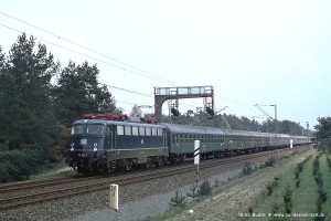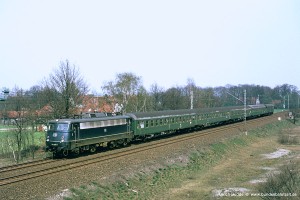 Zuerst wollte ich gar nicht glauben, was ich da soeben gesehen und fotografiert hatte: Eine Bügelfalten-E10 mit einzelnen Lüftungsgittern. Und tatsächlich, in dieser Ausführung mit Doppeldüsen-LG ohne Seitenfenster sollte die Hamburger 110 321 (neben 110 291) stets ein besonderer Exot bleiben. Am 03.05.74 eilt sie bei Wettmar (Krs. Großburgwedel) mit E1571 durch die südlichen Ausläufer der Lüneburger Heide. |