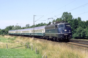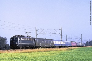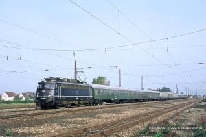 Ob der Lack schon trocken ist? Ganz frisch aus dem AW kam 110 331 (MüH), als sie mir am 16.07.77 bei Kutzenhausen vor die Kamera fuhr. Lange Klatte-Gitter, lange Gummileiste und Griffstange – alles Merkmale der ersten ozean-blau/beigen 110.3. Personenzug 4077 war übrigens ein Jahr zuvor noch eine 117er-Leistung, doch inzwischen hat die Verdrängung von oben nach unten durch die neuen 111 beim Bw München Hbf bereits voll eingesetzt. |
