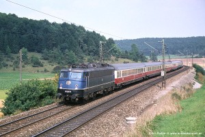 Oben auf der schwäbischen Alb bei Urspring ist es kurz darauf die Stuttgarter 110 294, die den stark verspäteten IC597 "Herkules" nach München bringt. Zur Planzeit des IC war eine 103 mit zwei IC-Wagen als kurzfristig eingelegter Ersatzzug gekommen. 01.09.79. |