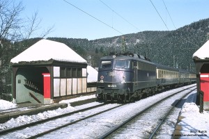 110er im TEE-Einsatz. An der österreichisch/italienischen Grenze am Brenner hat die Münchener 110 329 den TEE84 "Mediolanum" übernommen, um ihn auf seiner letzten Etappe über Innsbruck nach München zu bespannen. Der Zug ist komplett aus den damals brandneuen TEE-Wagen der FS gebildet. Kurz hinter dem Abzweig der Strecke nach Holzkirchen legt sich der Zug am 02.02.75 bei Rosenheim in die Kurve. |