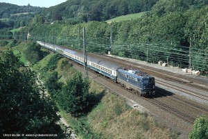 Kurze Zeit später, nur wenig weiter in Richtung Hagen, kommt mir am gleichen Tag die noch relativ frisch umlackierte 110 402 (KDfd) mit D2640 entgegen. Westhofen, 24.09.83; das war früher eine klassische Fotostelle für die Hagener 03.10 - nur leider vor meiner Zeit. |