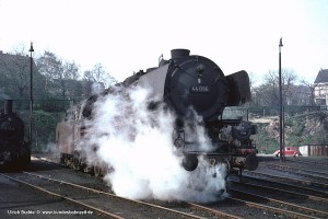 Bei meinem letzten Besuch des Bw Vohwinkel im Jahr 1967 wurde ich von 50 2857 mit abblasenden Sicherheitsventilen empfangen. Nach dem ersten Schreck reichte die Zeit gerade noch für eine Aufnahme dieses ohrenbetäubenden Ereignisses. Neben der 50er steht 94 1651 (vgl. Bild 19) und auch die Eckeseyer E41 296 ist wieder zu Gast in Vohwinkel. |