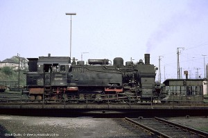 An der hinteren Drehscheibe konnte am gleichen Tag 94 892 auf den Film gebannt werden. Ungünstig stehende Masten und sonstiges Gerümpel zwangen mich dazu, die Lok ziemlich "saugend" ins Bild zu nehmen, was ich aus heutiger Sicht etwas bedauerlich finde. |
