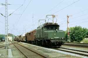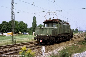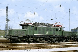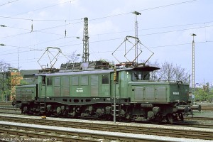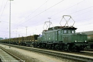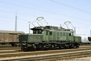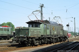 Bei einer vmax von 90 bzw. 100 km/h war der Umbau der Stromabnehmer auf die Bauart SBS 39/54 mit Doppelschleifstück-Wippe nicht vordringlich. Mit der Ausmusterung der Baureihe 118 standen diese Stromabnehmer allerdings zur Verfügung und wurden auf den 194 abgefahren, bevorzugt auf den Ingolstädter Maschinen wegen des Einsatzes vor schweren Ölzügen. Aufnahme: 194 122-8 (Ing), München-Moosach, 30.08.85. |
