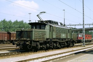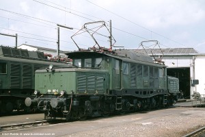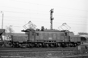 Zur Erprobung neuer Komponenten wurden die Fertigbau-Lokomotiven E94 141 und 142 mit einem leistungsfähigeren Transformator und einem Hochspannungs-Schaltwerk von BBC ausgerüstet. Durch den größeren Raumbedarf musste die Widerstandsbremse entfallen und damit auch der für die E94 typische hohe Dachaufbau für die Bremswiderstände. Stattdessen gab es nur noch eine flache Dachhaube. Aufnahme: 194 542-7 (Afb), Aschaffenburg Rbf, 02.04.71. |