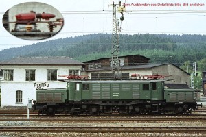 Alle AEG Maschinen und auch die Nachbau-Loks von SSW besaßen als Hauptschalter einen Druckgasschalter der Bauart APB104. Einige dieser Loks erhielten später wegen Ersatzteilmangels den Neubau-HS DBTF20i200 (s. Punkt 16). Aufnahme: 194 023-8 (NüR), Pressig-Rothenkirchen, 19.09.76. |