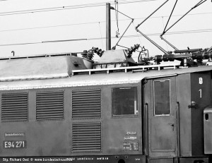 Vermutlich von Loks der Baureihe E18 erhielten (mindestens) zwei E94, beide vom Bw Regensburg, altbrauchbare Stromabnehmer der Bauart HISE2. Erst Anfang der 1970er Jahre erfolgte die Umrüstung auf reguläre SBS39 Stromabnehmer. Fremdaufnahme unbekannter Herkunft: 194 063-4 (Reg). |