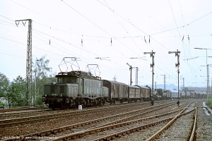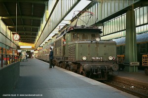 Die Anhebung der Höchstgeschwindigkeit von 90 auf 100 km/h bei den mit Fahrmotoren WBM 487 und Transformatoren höherer Leistung ausgerüsteten Loks führte am 28.12.70 zur Umzeichnung dieser Maschinen in die Baureihe 194.5. Technische Umbauten waren damit nicht verbunden. Die Umzeichnung diente allein einer eindeutigen Unterscheidung zu den 194.0 mit vmax 90 km/h. Aufnahme: 194 575-7 (NüR), Frankfurt(M) Rbf, 06.04.79. |