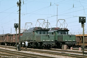 Auch die Nachbauloks E94 270 und 271 waren mit einem Hochleistungstrafo und Hochspannungsschaltwerk ausgerüstet, in diesem Fall jedoch von SSW. Wie bei den BBC-Maschinen musste auch hier auf die Widerstandsbremse verzichtet werden. Trotzdem war eine relativ hohe Dachhaube erforderlich, die in ihrer Formgebung bereits stark an die der Einheits-Elloks erinnert. Aufnahme: 194 570-8 + 194 571-6 (NüR), Pressig-Rothenkirchen, 27.10.79. |