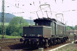 Zwei Rotlicht-Loks, nämlich 194 581 und 585, waren zumindest zeitweise mit Drehgestellen mit AK-Vorbereitung und mit eingebauten Lampen ausgerüstet. Auch die spätere Museumslok 194 579 erhielt zum Schluss noch solche Drehgestelle (ex 581). Aufnahme: 194 585-6 (NüR), Laufach, 05.06.80. |