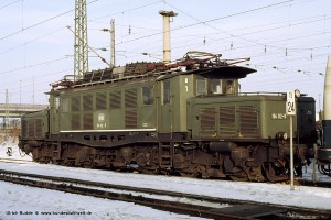 Bei den wenigen Loks, die ab Mitte der 70er Jahre noch eine Neulackierung erhielten (zumeist nach der Beseitigung größerer Unfallschäden), rückte das etwas größere DB-Emblem nach unten und die Loknummer wurde auf dem Lokrahmen platziert (siehe auch Bild 19). Aufnahme: 194 161-6 (NüR), eine Fertigbaulok, Bw München Hbf, 28.01.87 (mit versetzter Nummer). |