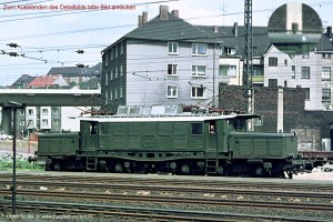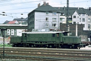 Für den Schiebebetrieb auf der Spessartrampe wurden die Aschaffenburger E94 ab 1957 mit einer Sprechfunkverbindung, dem sog. Schiebefunk, ausgerüstet. Die dafür notwendige Topfantenne war anfangs auf einer der Vorbauhauben, später auf dem Vordach angeordnet (siehe Bild 4 u. 14). Der Schiebefunk wurde später durch den Zugbahnfunk abgelöst/ersetzt. Aufnahme: E94 273 (Afb), Hagen Hbf, 24.05.66. |