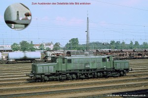 Nur anhand von Bildern ist belegt, dass ab Mitte der 70er Jahre zahlreiche 194 mit einer UIC-Steckdose ausgerüstet oder zumindest dafür vorbereitet wurden. Diese ist nicht zu verwechseln mit der Anfang der 50er Jahre an- und rund 10 Jahre später wieder abgebauten Packwagen-Steckdose, die direkt oberhalb der Pufferbohle angeordnet war. Aufnahme: 194 051-9 (Aug), Bw Augsburg, 30.04.80. |