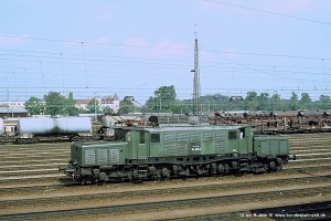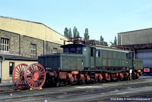 Bei der Deutschen Reichsbahn in der DDR verblieben insgesamt 23 Loks, die mit Einführung der neuen Nummern zum 01.01.70 als Baureihe 254 bezeichnet wurden. Gegenüber den DB-Loks fallen vor allem das fehlende Vordach und die Neubaustromabnehmer RBS58 ins Auge. Ausgesprochen gut stand den Loks das DR-Farbschema mit hellrotem Fahrwerk. Aufnahme: 254 106-8 (Edf), Bw Engelsdorf, 30.05.91. |