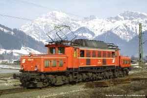 Das ab 1970 angewandte neue Farbkonzept der ÖBB sah eine Farbgebung aller Lokomotiven in blutorange vor und wurde auch bei der 1020 umgesetzt. Anfangs waren das Dach silbern (nach [2] beige) und das Fahrgestell schwarz lackiert. Später wurden sowohl das Dach als auch das Fahrwerk dunkelgrau lackiert. Aufnahme Herbert Schambach: 1020.06 (Ibr), ex E94 031, Saalfelden, 03.04.86. |