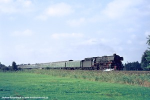 Am 16.09.69 begann der nächste Foto Tag mit ein paar Aufnahmen in Struckum, wo es damals noch einen richtigen Bahnhof an zweigleisiger Strecke gab (heute ist die Marschbahn hier auf ein Gleis zurückgebaut und Struckum besitzt nicht einmal mehr einen Haltepunkt). Den Auftakt machte 012 105-3 mit einem langen Zug aus Altbauwagen. Um etwa 8:00 Uhr morgens käme der Ferneilzug E576 nach Trier in Betracht; der Wagenpark spricht allerdings mehr für einen Sonderzug. |
