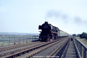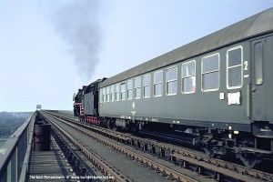 Für den ersten Nordfahrer traute sich der Fotograf sogar ein kleines Stück auf die Brücke hinauf – eine Position, wie sie heute aus vielerlei Gründen undenkbar wäre. Schon lange vorher war der harte Auspuffschlag der 012 zu hören, obwohl 012 080 mit dem kurzen E1701 keine allzu große Mühe gehabt haben dürfte, die Rampe hinauf zur Brücke zu bewältigen. |