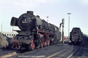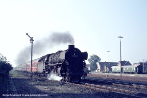 Am 02.08.71 stand der Fotograf unmittelbar unter dem Stellwerk am BÜ Poststraße, um den ohne Halt mit 012 102 durch den Bahnhof rauschenden D675 (?) auf den Film zu bannen. |
