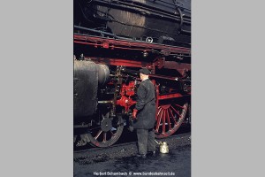 Viel zu selten wurde das Personal bei der Arbeit an den Maschinen aufgenommen. Herbert S. hat's gemacht und dem Heizer beim Abölen des Triebwerks ein bildliches Denkmal gesetzt. |