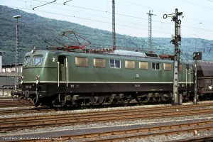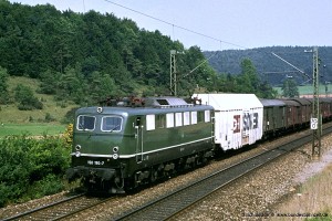 Wie bei den anderen Einheits-Ellok Baureihen gab es auch bei der 150 einige Maschinen, bei denen die Blechregenrinne nur an den Stirnseiten entfernt und durch eine Gummileiste ersetzt wurde. Aufnahme: 150 082-6 (Beb), auf der Spessartrampe bei Hain, 05.06.80. |